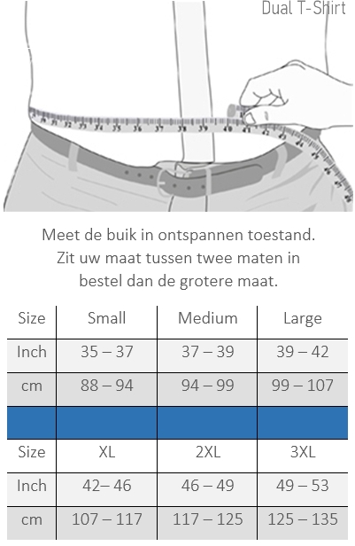 Meet je buik in ontspannen toestand. Zit je tussen twee maten in, kies dan de grotere maat.